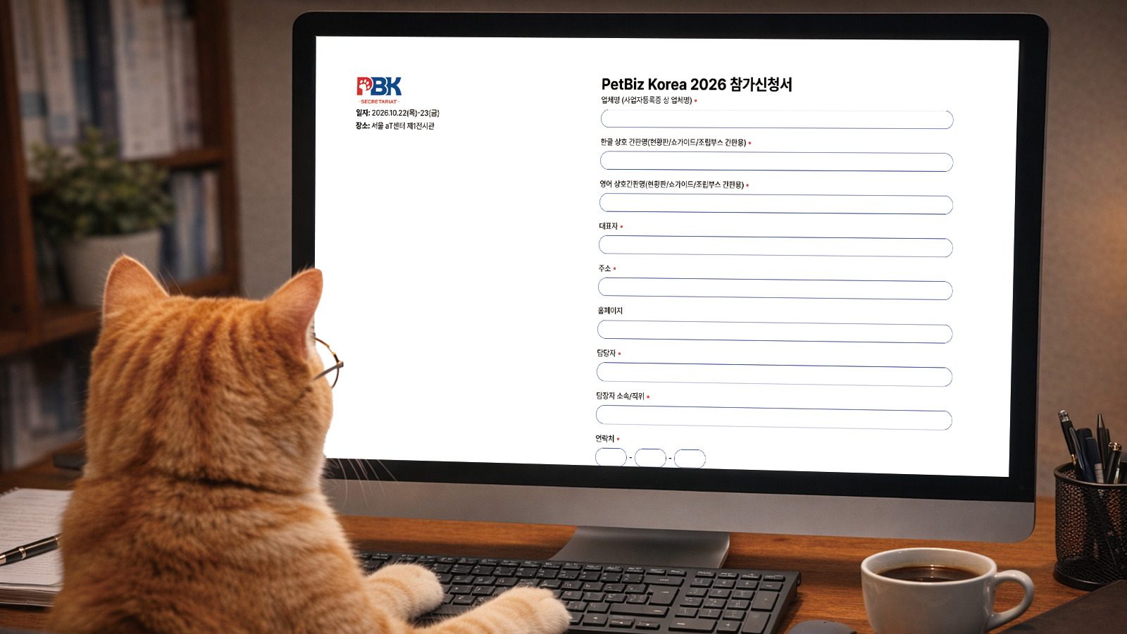 스크롤을 아래로 내리면 나오는 PetBiz Korea 2026 참가신청서를